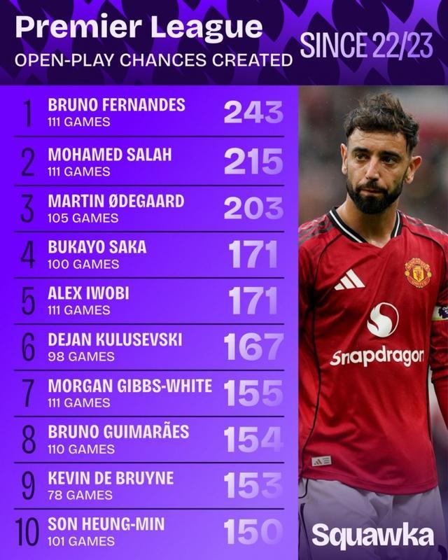 直播吧9月11日讯 数据显示,自2022/23赛季开始,B费是英超运动战创造机会最多的球员。