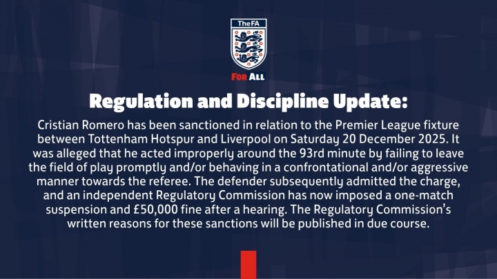 克里斯蒂安・罗梅罗因2025年12月20日(周六)托特纳姆热刺对阵利物浦的英超赛事,遭到纪律处罚。